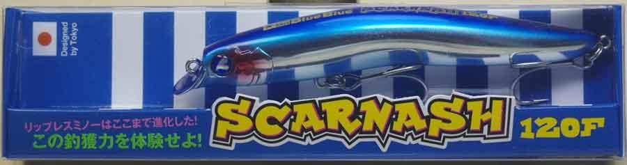 120mm/18g フック #3×2個/レンジ 30〜90cm リップレスミノーは、ここまで進化した! この釣捕力を体験せよ! ファットボディが生む強波動とイレギュラーなフラつきアクション! 向かい風もお構いなし!120mmクラス最高峰の飛距離! 大きいフックが搭載出来る2フック仕様で大型魚も安心! スカーナッシュ120Fは、大型タングステン球を搭載した重心移動システムの為、同サイズのミノープラグとしては圧倒的な飛距離を実現。アクションは、力強いロールアクションで、特徴的なテール形状とファットボディにより、強波動を生み出します。その強波動とロールアクションのフラッシングにより、同サイズのリップレスミノーとしては、最高レベルのアピール力を発揮します。また、高速域では、イレギュラーにフラつく様なアクションで、魚が思わず口を使ってしまうことでしょう。フックは、2フック仕様で、3フックタイプのルアーよりも大型のフックを搭載でき、不意に大型魚と対峙する場面も、安心してファイト出来ます。またフックサイズを変更する事でシンキング〜サスペンド〜フローティングの浮力調整も可能になっており、お好みに合わせて様々なシュチュエーションに対応出来ます。 ※使用場所の塩分濃度により.,スローシンキングになる場合が御座います。 Blue Blueホームページ