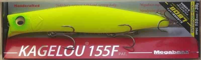 ランカーハンター久保田剛之プロデュースによるカゲロウシリーズの第3弾がKAGELOU155F。シーバスが表層を意識し、ボラや落ち鮎、コノシロ等の大型ベイトを捕食する状況で、ボリューム感のあるハイアピールボディが、最も効果を発揮。大きく切られたダーターカップは水を受ける表面積の拡大により、更に水を強く動かしターゲットへアピール。