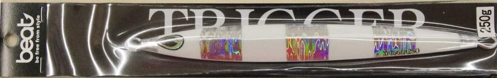 250g ハイピッチ×スローピッチ 捕食本能の引き金を引け! 2枚潮、潮流に左右されにくいセンターバランスで引き抵抗の少ない抜けの良い青物に有効なジグ 何年間ものテストを繰り返したどり着いたTRIGGER 引き抵抗の軽さ、アングラーのストレスを最小限に抑え、リズミカルなハイピッチジャークを実現。 スライドに関しても感度よくアングラーからの軽いインパクトで素直に横を向きスライド。またフォール、上げ共に潮切りの良いボディの大型4面カットはどの角度からもターゲットにインパクトのある残像でアピールします。ハイピッチは「勿論、厚みの有るセンターバランスは、スローピッチの要素もプラス。 特に根に付いた大型カンパチ等に有効。 ハイピッチで誘い揚げ横方向にステイ、スライドフォールなど多彩なアクションを高次元で演出。 フックのセッティングもフロントオンリー、前後のフック、スローの4本針等、状況に合わせて色々アレンジしてください。 トリガーシリーズのサイズバリエーションは水深、潮流、ベイトシルエットに合わせてご使用いただけるように豊富にラインナップしておりますので、ぜひ状況に応じてセレクトしてください。 MADE IN JAPAN beatホームページ