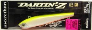 82mm/12g シンキング! フロント ST-46 #4トレブル、リア ST-46 #6トレブル標準装備 二次元アクションによりシーバスゲームの活性を上げてリアクションバイトを誘発させるオールレンジ攻略ジャークベイト。 特に日中のシーバスゲームにおいては、視界が効く為、スローなだけのアクションは見切られてしまう。 そこで有効なのが、ジャーキングによるダートアクション。 ルアーを高速又は、派手に動かすことで、日中ストラクチャーや流芯部、みお筋、海草帯、ブレイクライン等に身を隠し、ベイトフィッシュび回遊を持っているシーバスに対し、ルアーの存在を確実にアピール。 ポーズを加えたり、ただ単調なダートの繰り返しのみでも見切られてしまうし、ダートの幅が大きいだけのルアーでは、シーバスは追いきれずバイトに結びつかない。 このDARTIN’Zは従来の単に左右に大きくダートするだけのルアーと異なり、ソフトベイトに端を発したDARTING理論に基づくローリングを交えたダートアクションを発生。 さらに、そのダートアクションはエッジの効いたフラット面を多用したボディによりジャークやトゥィッチのストロークでダートの幅をコントロールできる。 それだけでも充分釣れるがミディアムストレートリトリーブにおいて発生するタイトなフラツキアクションを演出できることがキモ。 ストレートリトリーブとジャークのコンビネーションにより食わせのタイミングをアングラーが設定し狙ったポイント(ブレイク、橋脚、海草帯など)できっちりバイトを誘発させる今までに無い二次元ジャークベイトです。 着水後狙いの水深までカーブフォールさせ、ストレートリトリーブとジャークを変幻自在に組み合わせる。 このときラインスラックを取り過ぎるとルアーの激しいターンでフックがラインを拾いやすい為、連続ジャークはリズミカルに行うことがキモ。 ダイワ精工ホームページ